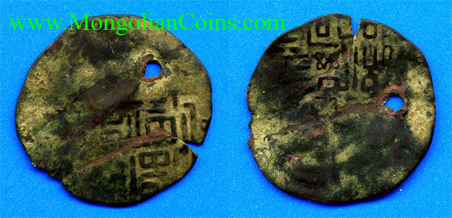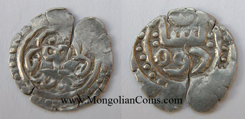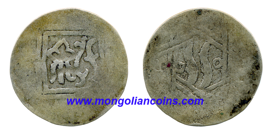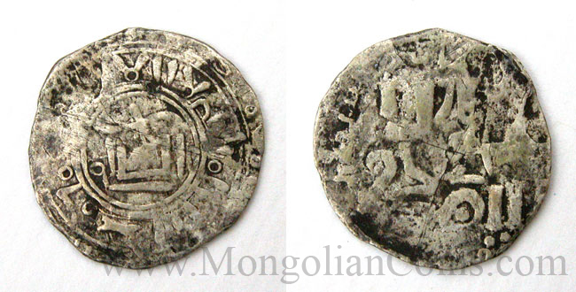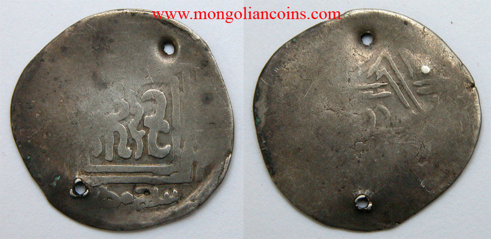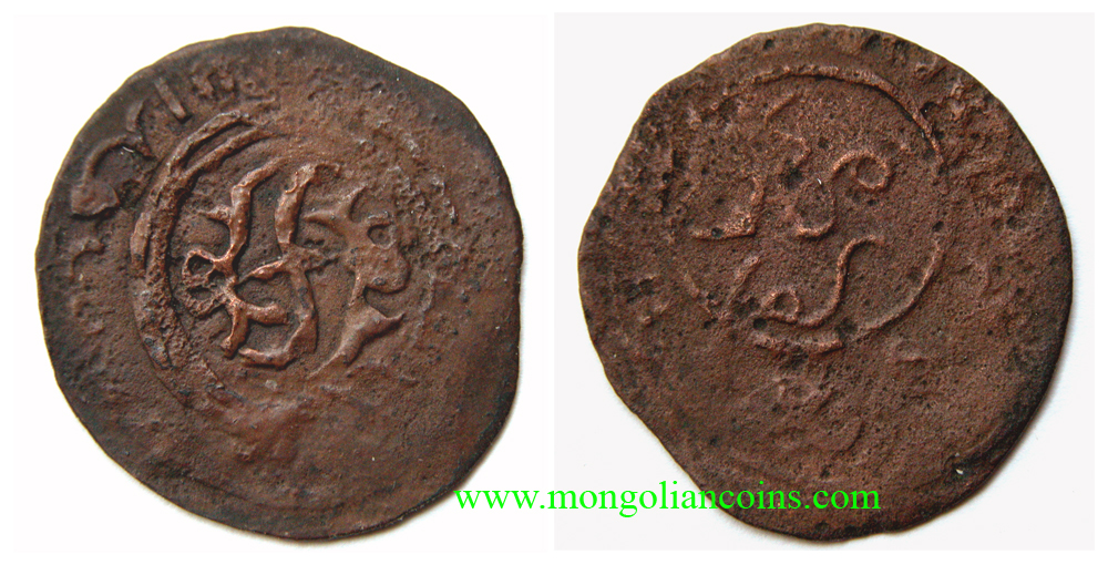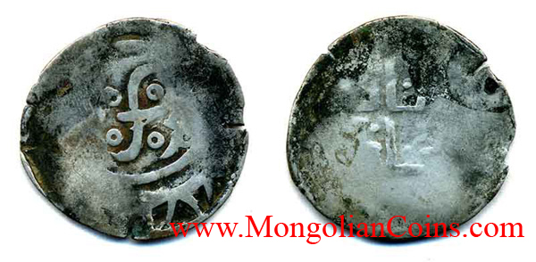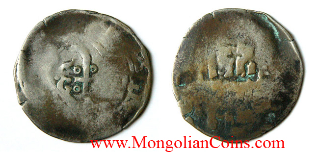 Degere tamgha (Qaidu, Duwa) at the right. Reverse: Ugudei's descendant's tamgha - in the center. 23mm
