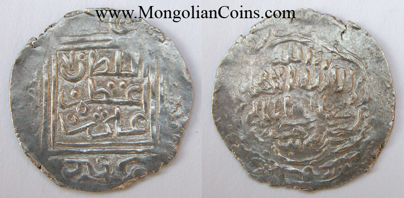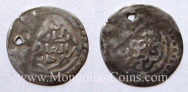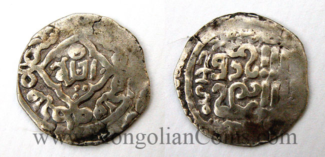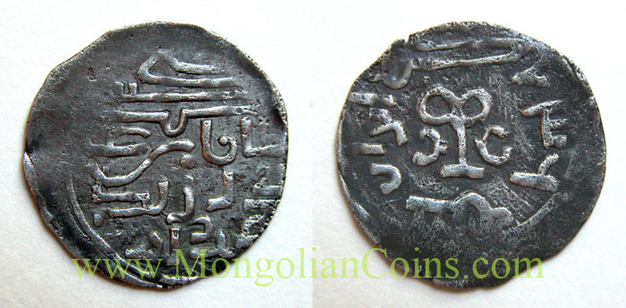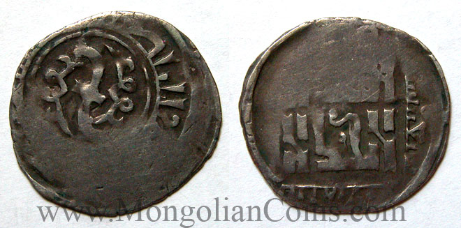 Almaligh mint. Obverse: Mint name and Tamgha of Ugudei's descendents. Reverse: "The King