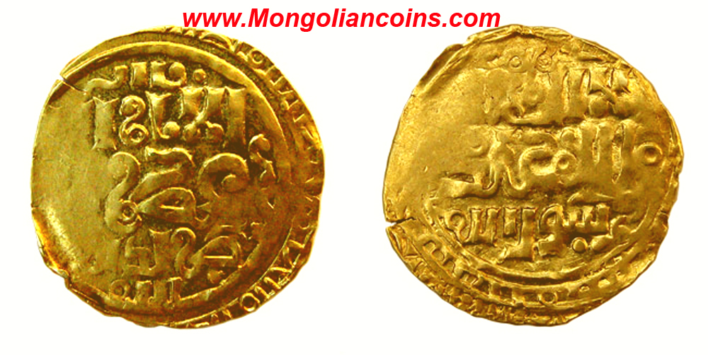 dinar. Anonymous type. Almaligh mint. 637AH/1239AD. Obverse: Khaani Al-imam Al-a'zam An Nasir