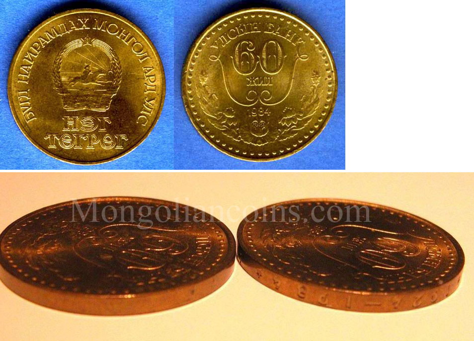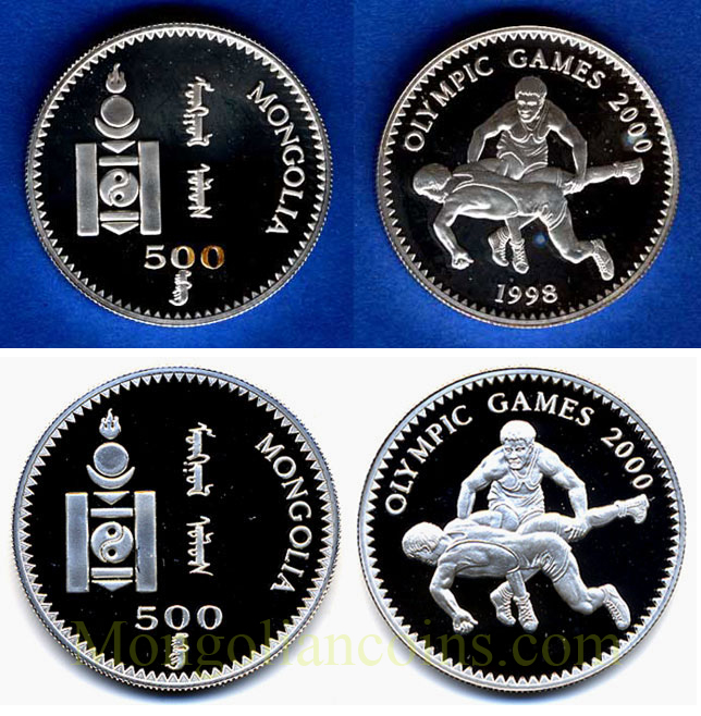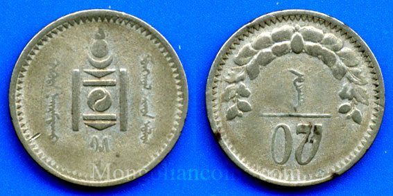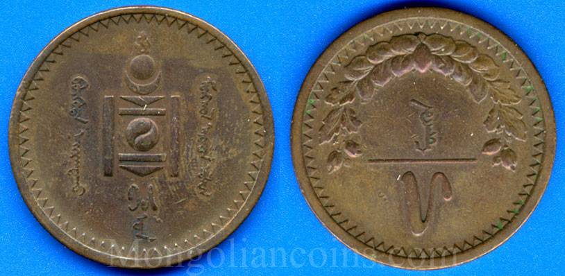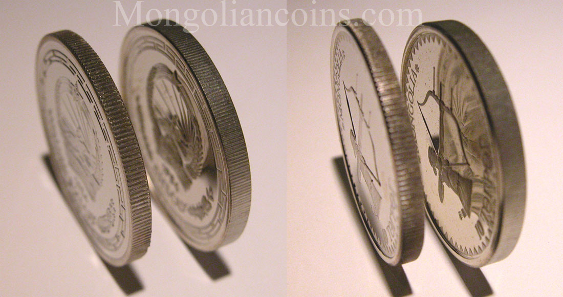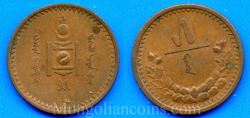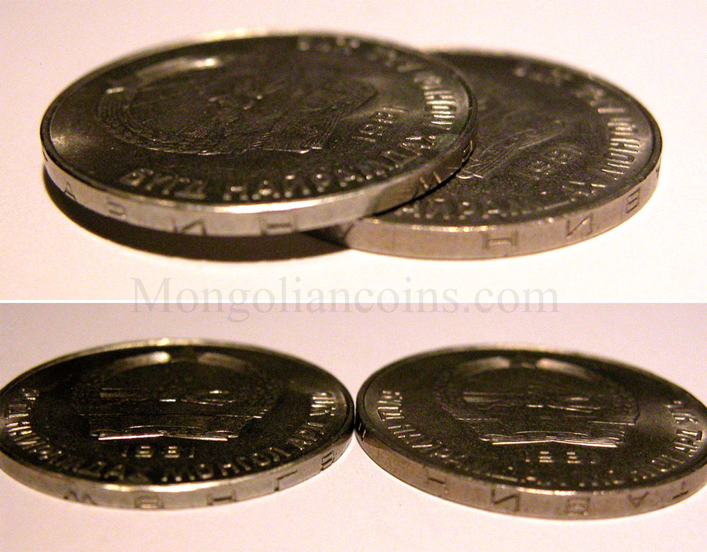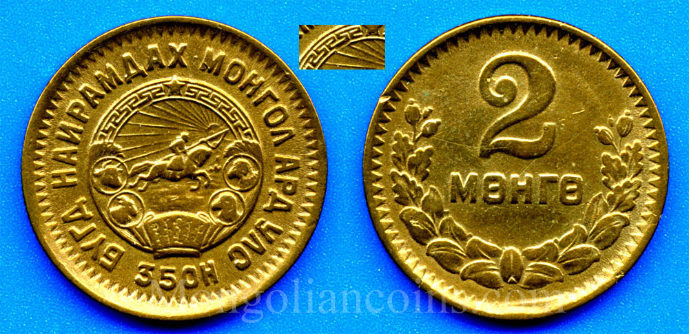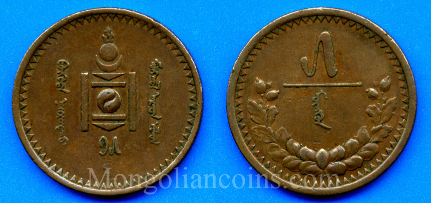 there is a Mongolian National Symbol ?Soyombo? facing upwards. On this particular coin the ?Soyombo? faces