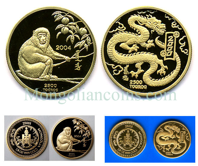 This is a peculiar Mongolian gold coin minted in error. On the obverse side of this 2004 Year of the Monkey